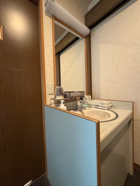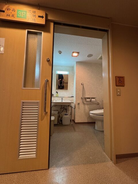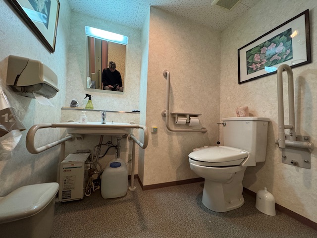 Il bagno in camera è costituito da un piccolo ambiente dotato di wc, piuttosto improbabile da usare in carrozzina sia per le dimensioni ridotte sia per l’assenza di dispositivi di appoggio, mentre il lavandino si trova a vista nell’ingresso camera. Tuttavia, a pochi metri dalla porta della camera era presente un bagno comune attrezzato anche per l’uso da parte di ospiti con disabilità motorie, decisamente più comodo. Faccio notare che nessuno dei due bagni è dotato di doccia, questo perchè in molti ryokan tradizionali  gli ospiti utilizzano i bagni comuni termali dell’edificio per lavarsi. Un altro bagno/spogliatoio disabili è presente al piano terra, nelle vicinanze dell’ingresso all’onsen.
