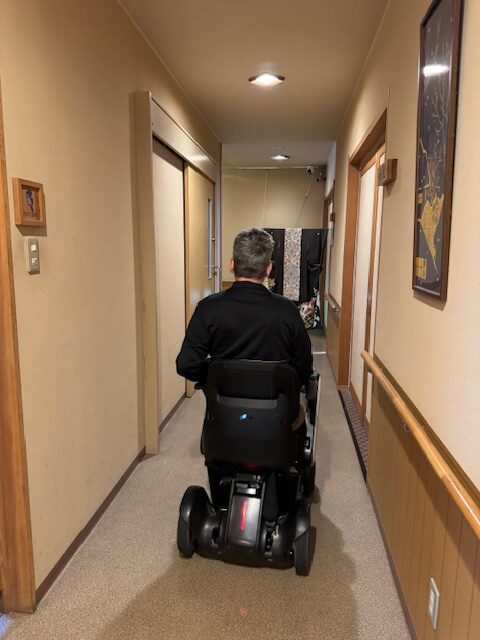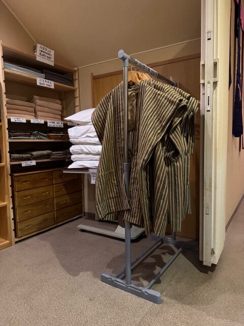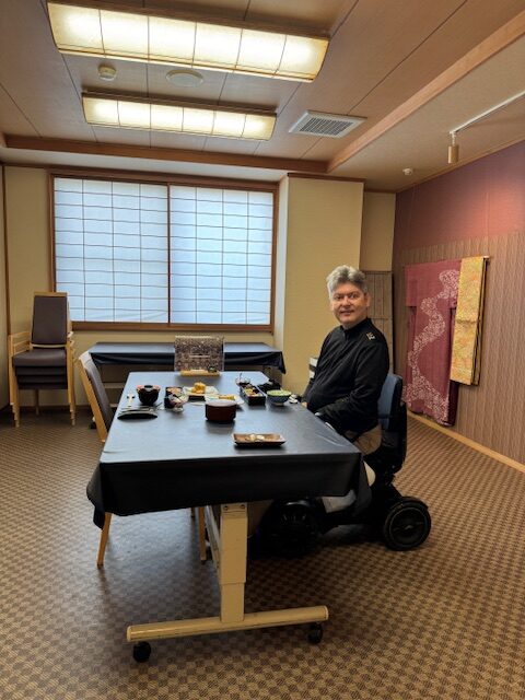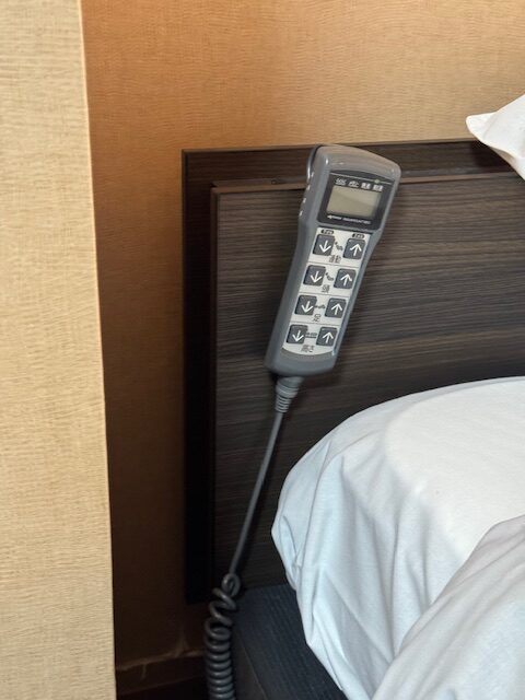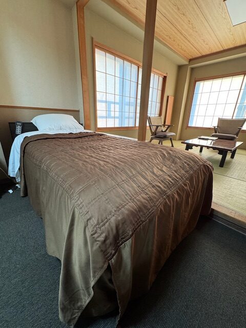 La camera che ci è stata assegnata si trova ai piani superiori, raggiungibili con l’ascensore. La stanza è molto ampia, e risulta suddivisa in due parti chiaramente distinte. Superato l’ingresso, dove è situato un lavabo a vista e la porta del bagnetto privato, si entra nella prima parte della camera, realizzata in stile “occidentale”: le pareti sono intonacate, i pavimenti finiti con moquet e sono posizionati due letti singoli dotati di sollevatore elettronico. Separata da un gradino, si sviluppa la seconda parte della camera, realizzata in autentico stile “ryokan”. Come da tradizione qui il pavimento è in tatami (pannelli di paglia di riso intrecciata), le ante delle finestre e dell’armadio sono a scorrimento (shoji) e realizzate in legno e carta di riso, al centro della stanza si trova un tavolino basso per la cerimonia del tè. Sembra che manchi ancora qualcosa, vero? E invece no! All’interno dell’armadio, oltre agli yukata (kimono leggeri da indossare durante il soggiorno), si trova anche il futon, ordinatamente riposto arrotolato durante il giorno, ma da adagiare sul pavimento per la notte. Come anticipato l’area in tatami risulta rialzata di un gradino ed è dunque off-limits per le carrozzine♿️ a meno di non usare una rampetta per superare il dislivello. Devo però anche ricordare che questa zona andrebbe fruita esclusivamente senza scarpe, per cui se ci si vuol accedere su ruote, bisognerebbe prevedere una qualche protezione del pavimento .